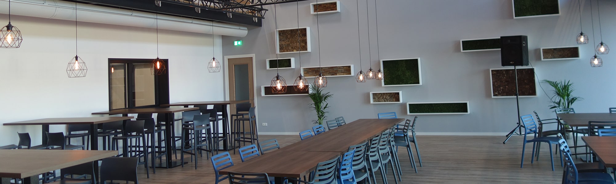 Inclusief een beweegbare truss in de kantine en een centraal touch bedieningspaneel, om de verlichting te besturen.